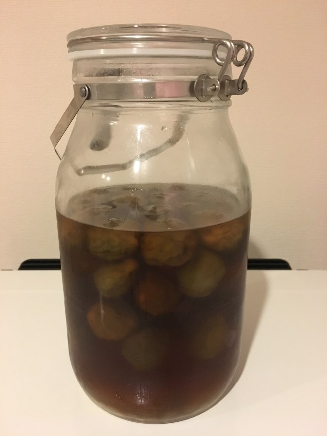 熱湯消毒したガラス瓶に、氷砂糖と砂糖と梅を交互に入れていくと、下ようなな感じになりました。2Lのガラス瓶を熱湯消毒するのは大変です。アルコール消毒の方がラクだったかも。砂糖は、石垣島のおいしいお砂糖というのを使ったので、色が茶色いです。