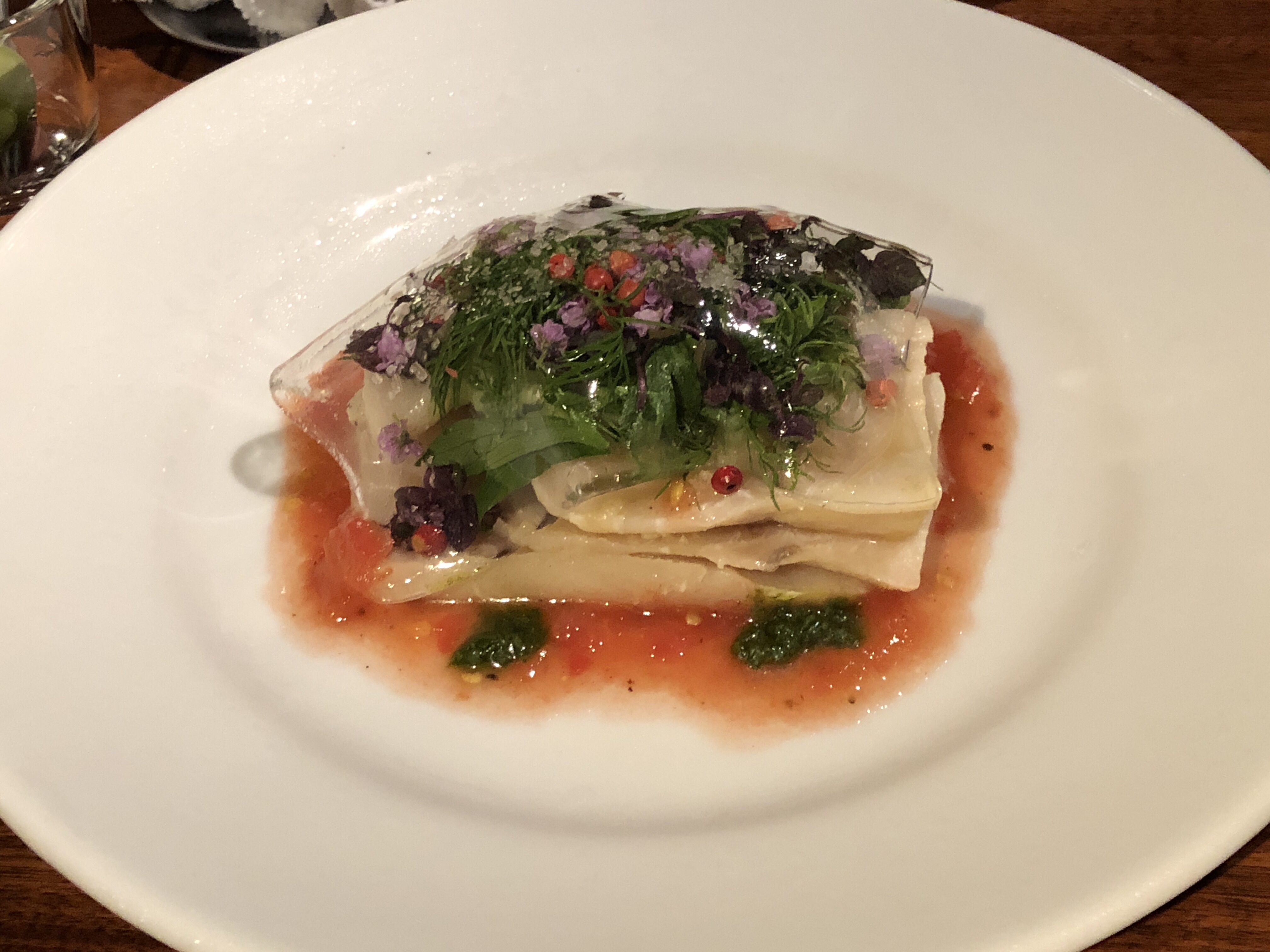 sio@代々木上原 (tabelog) – モダン系のフレンチ。店内の内装も今風のスタイルで、料理は一皿一皿に驚き、楽しさがありました。ノンワインペアリングがあるのですが、お茶をベースにした甘くないドリンクで、ワインペアリングのワインと似たような雰囲気に合わせてくれるので、2つのコースを比べて飲むと楽しいです。