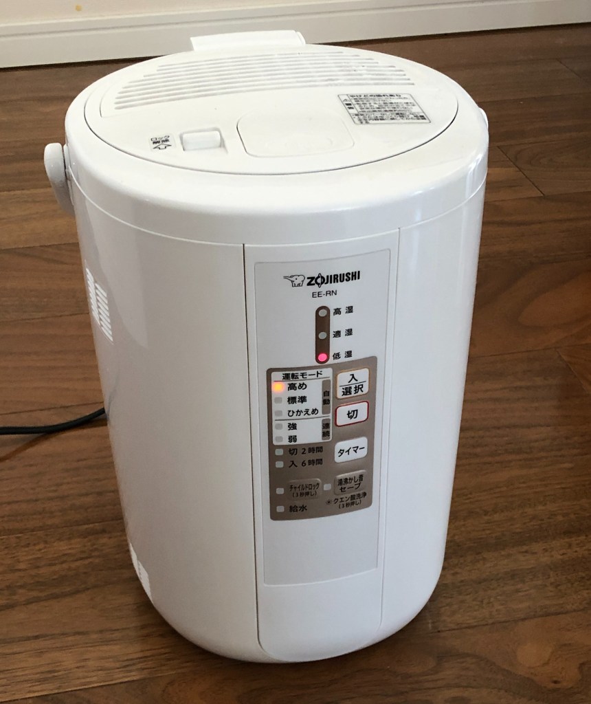 最初は、象印のスチーム式加湿器 (amazon)。もう型落ちしているらしく、amazonでは売っていませんが、1万円くらいで買いました。基本的にはポットです。常に熱湯消毒している状態なので、とても清潔なのが良いです。デザインがちょっと難ありなのですが、清潔を優先して我慢しました。