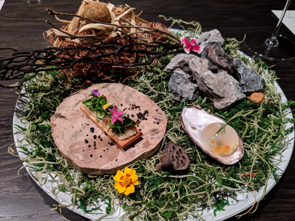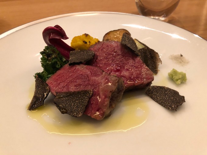L’EAU@外苑前 (tabelog) – 2018年の11月にオープンしたばかりのフレンチ。場所は外苑前駅から歩いてすぐ。黒を基調にしたおしゃれな内装で、お店の入り口には、まだ開店祝いのお花が飾ってありました。夜は12,000円のコース一本。新しいお店だけど、料理にもサービスにも余裕が感じられました。ワインペアリング(6000円)は、普段あまり飲まないオーストリアのワインが多くて楽しめました。どのお皿も安定して美味しくて、良いお店でした。すぐに人気が出る気がします。