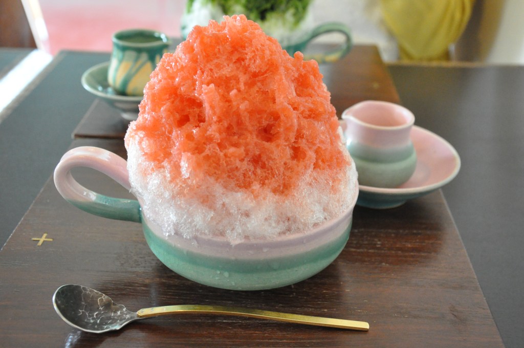 瑠庵 島色@うるま市 (tabelog) – 那覇市から車で1時間ちょっとの宮城島にあるかき氷屋さん。フルーツの果肉を使ったシロップが最高です。一口食べたとき、湘南の埜庵のかき氷みたい!!と思ったのですが、実際埜庵で修行されていたみたいです (link)。器は共同経営者の島袋克史さんのものが使われています。注文したかき氷に合わせた器で出てくるので、とても美しいです。写真の手前はいちごミルクなのでピンク色の器で、奥は抹茶ぜんざいなので緑色の器。お店がとても可愛らしくて、かき氷も最高に美味しいのでまた行きたいです。