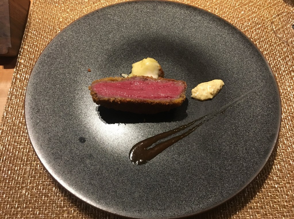 うしごろエス西麻布店 (tabelog) – うしごろ系列の高級ラインの焼肉屋さん。西麻布の交差点からすぐの、うしごろ本店と同じビルの地下にあります。全室個室で担当の店員さんが全部焼いてくれるスタイルです。予約人数が2人だと一番高いコースしか選べない仕組みですが、部屋を専有することになるので仕方ないですね。4人以上だとすべてのコースが選べるみたいです。シャトーブリアンのミルフィーユ(下の写真)というのが一番美味しかったです。これはすべてのコースで出るみたいなので、どのコースを食べても美味しいんじゃないかと思います。店員さんの感じが良くてよいお店でした。